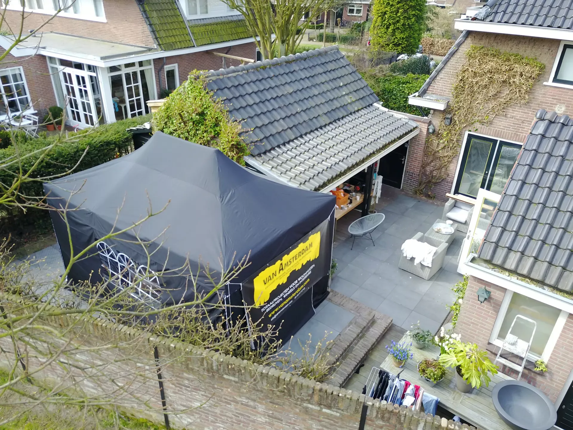 Van Amsterdam heeft een easy-up tent aangeschaft van 3 x 4,5 mtr. Klanten mogen deze gratis gebruiken om tijdelijk spullen op te slaan op het terras of in de tuin als wij binnen aan het werk zijn. Reseveer hem op tijd en wij brengen hem enkele dagen voor we beginnen met de werkzaamheden.