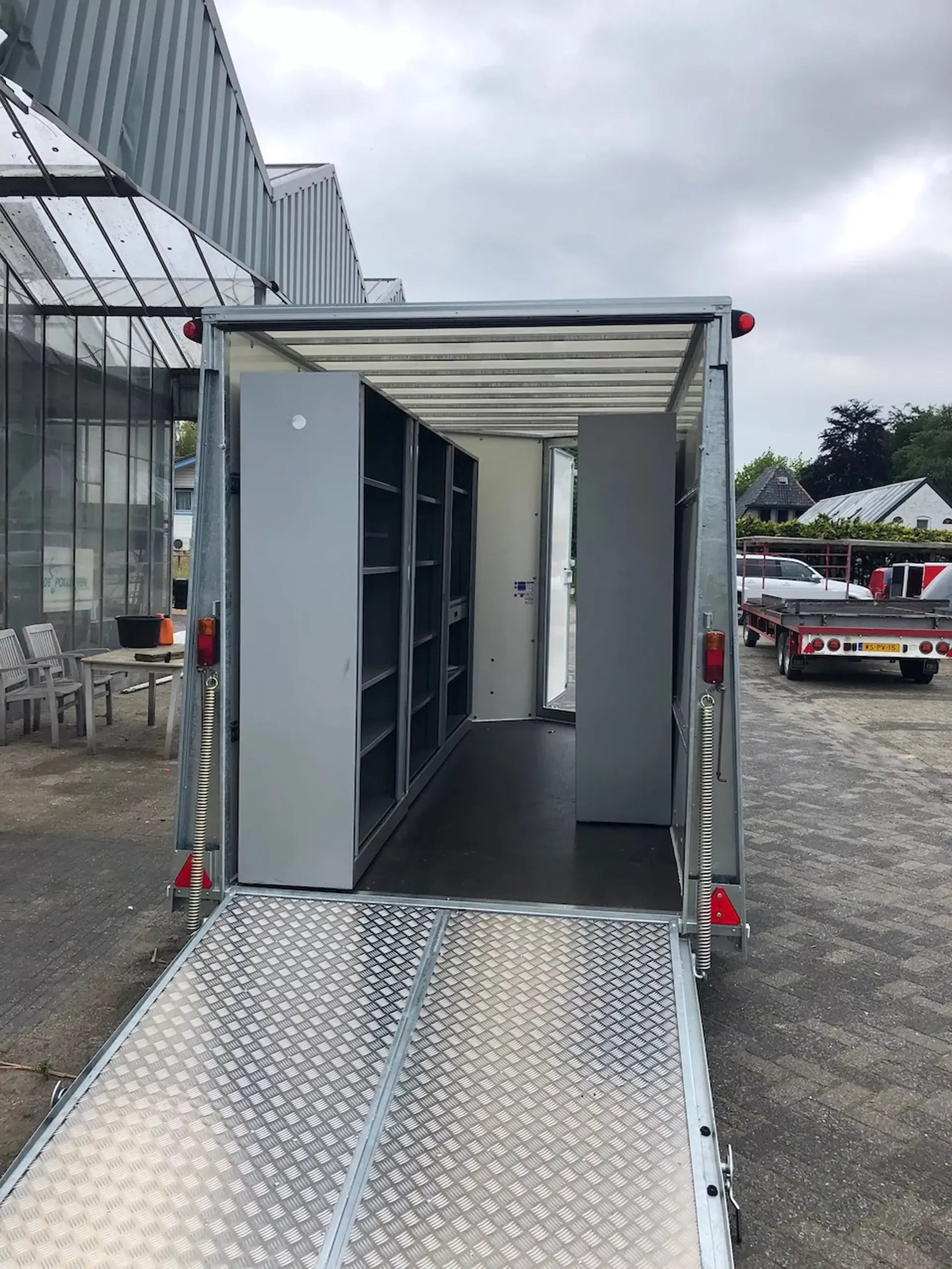 Achterzijde open met klep om ladders te laden en lossen. Deze komen boven de kasten.