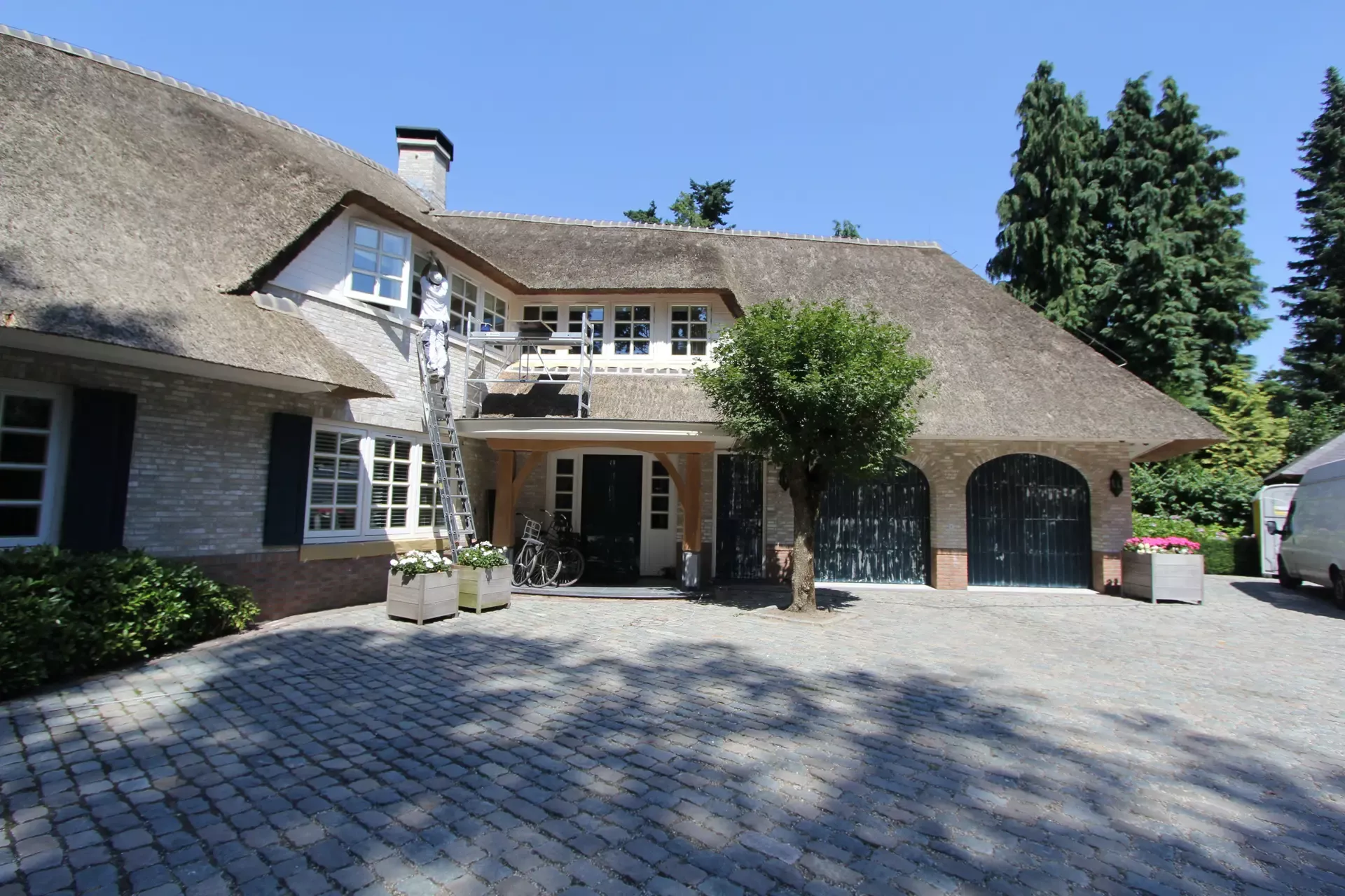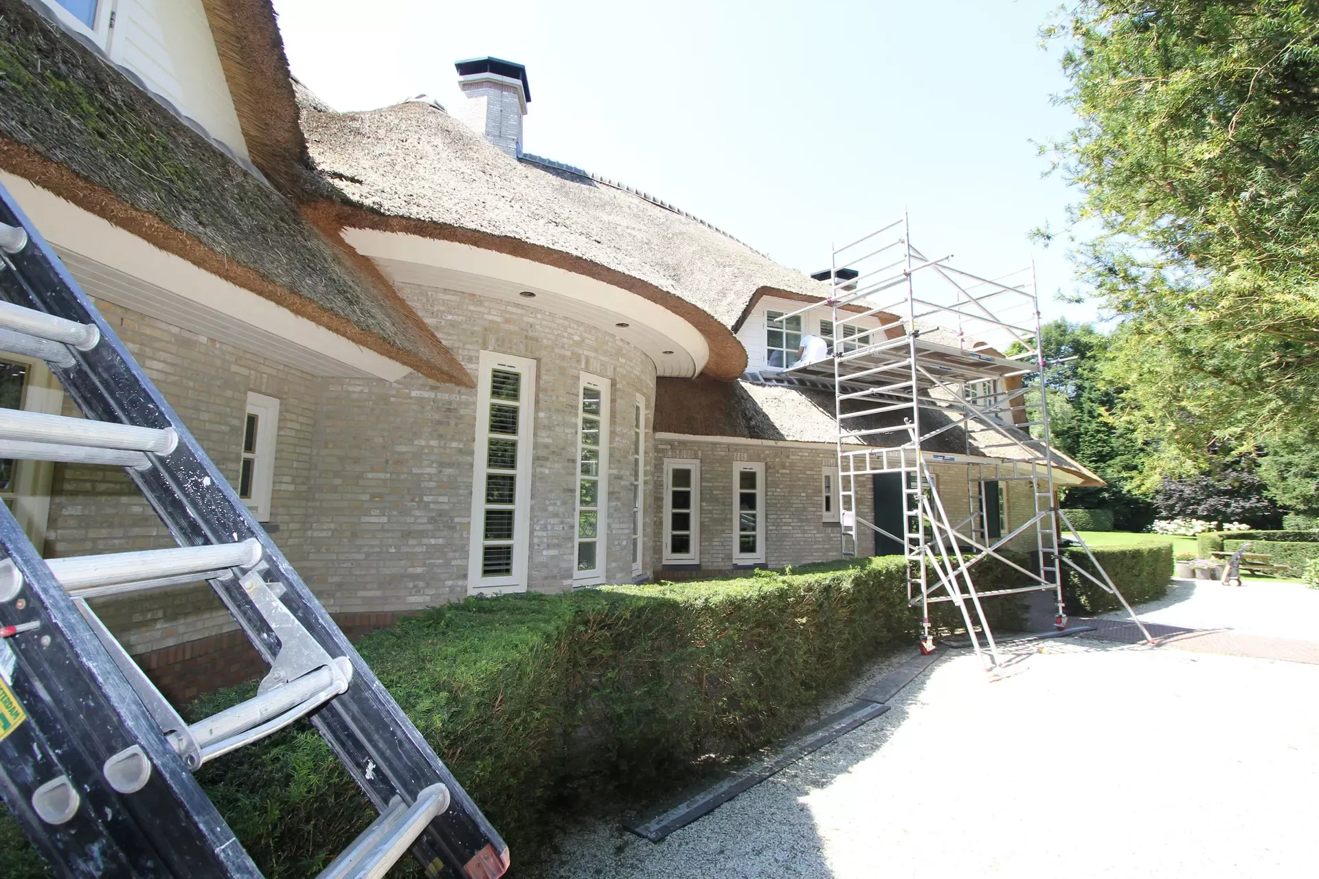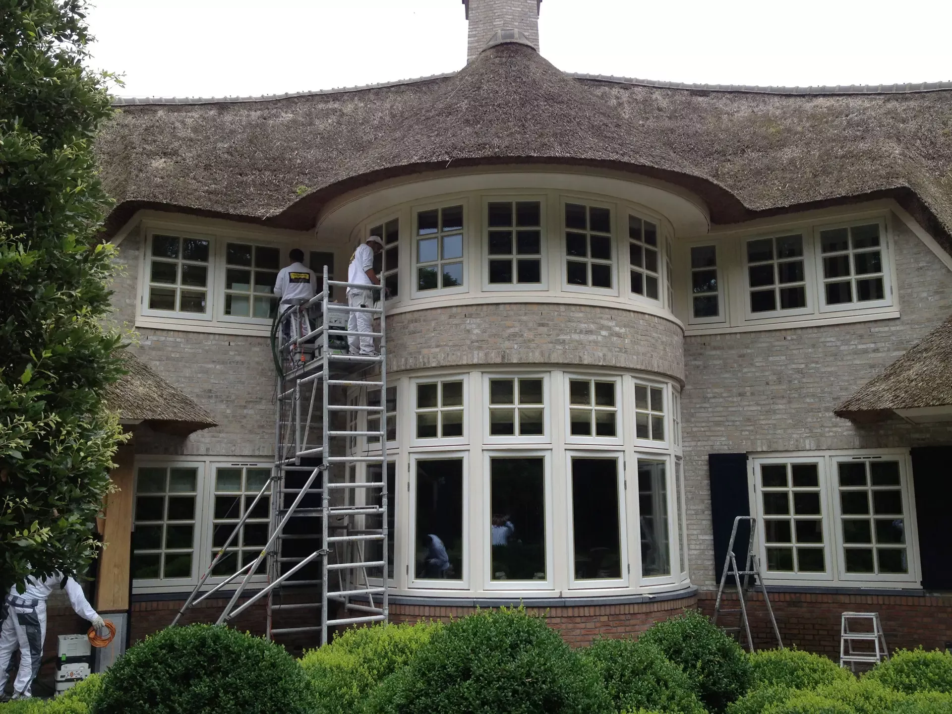 Na 10 jaar sinds de nieuwbouw was deze prachtige villa in Blaricum toe aan een grondige schilderbeurt. We hebben al het houtwerk aan de buitenzijde gecontroleerd op lekke naden en kieren, en waar nodig opnieuw gekit of gerepareerd met epoxy. Vervolgens hebben we het houtwerk voorzien van twee nieuwe lagen hoogglansverf en de kleur aangepast aan de hedendaagse trends.