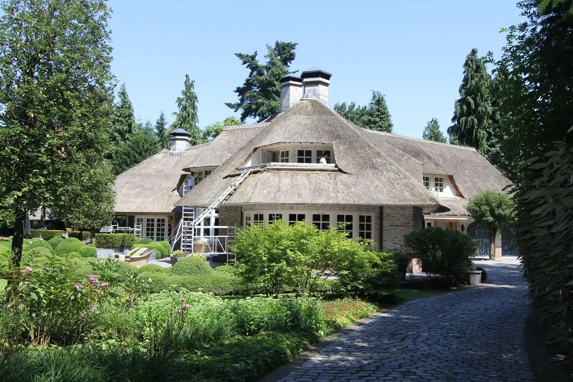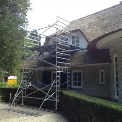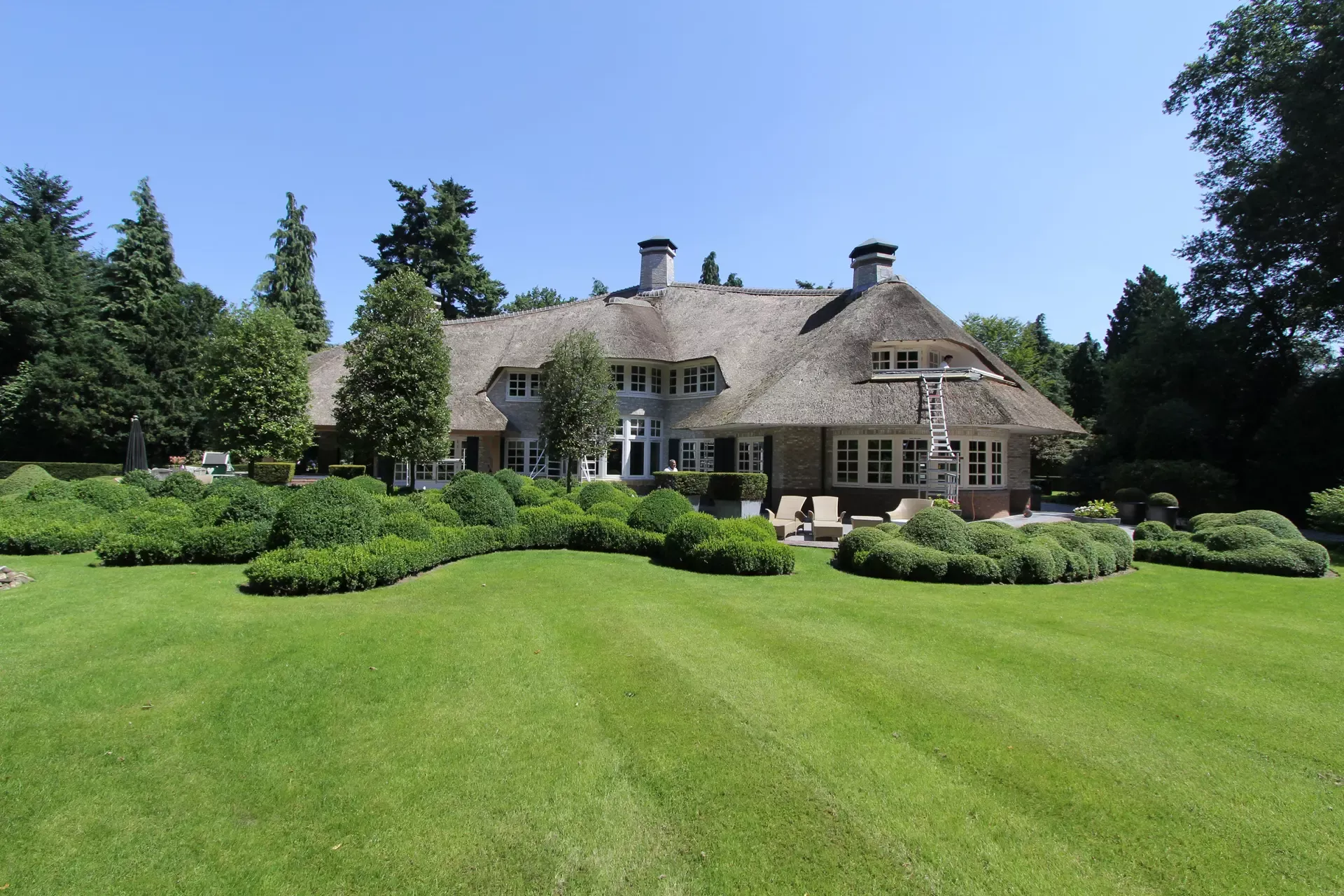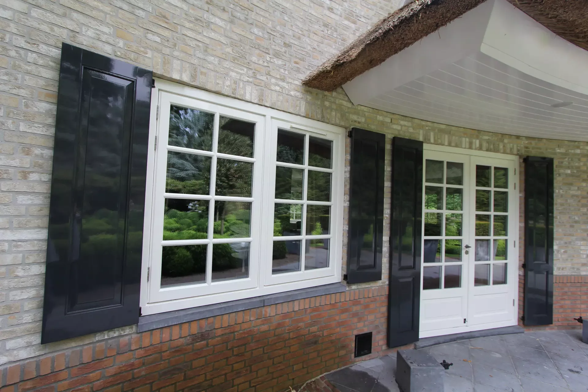 Na 10 jaar sinds de nieuwbouw was deze prachtige villa in Blaricum toe aan een grondige schilderbeurt. We hebben al het houtwerk aan de buitenzijde gecontroleerd op lekke naden en kieren, en waar nodig opnieuw gekit of gerepareerd met epoxy. Vervolgens hebben we het houtwerk voorzien van twee nieuwe lagen hoogglansverf en de kleur aangepast aan de hedendaagse trends.