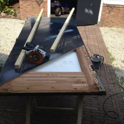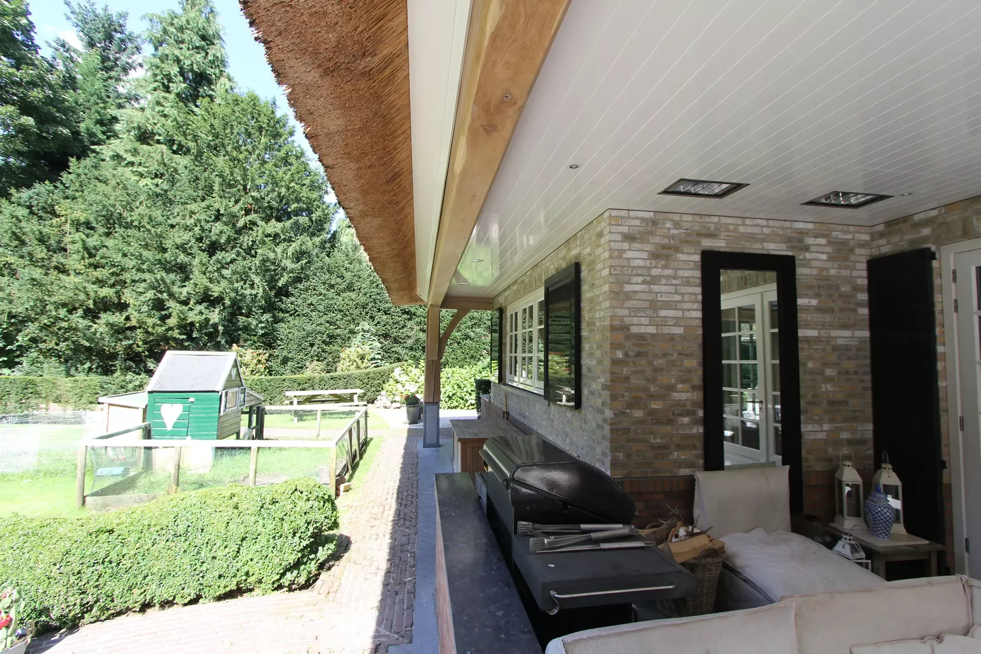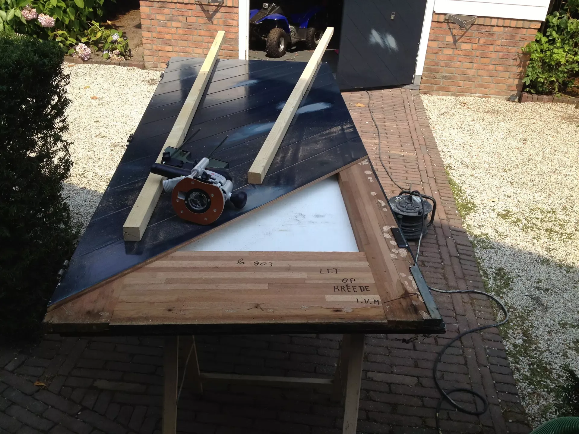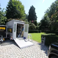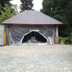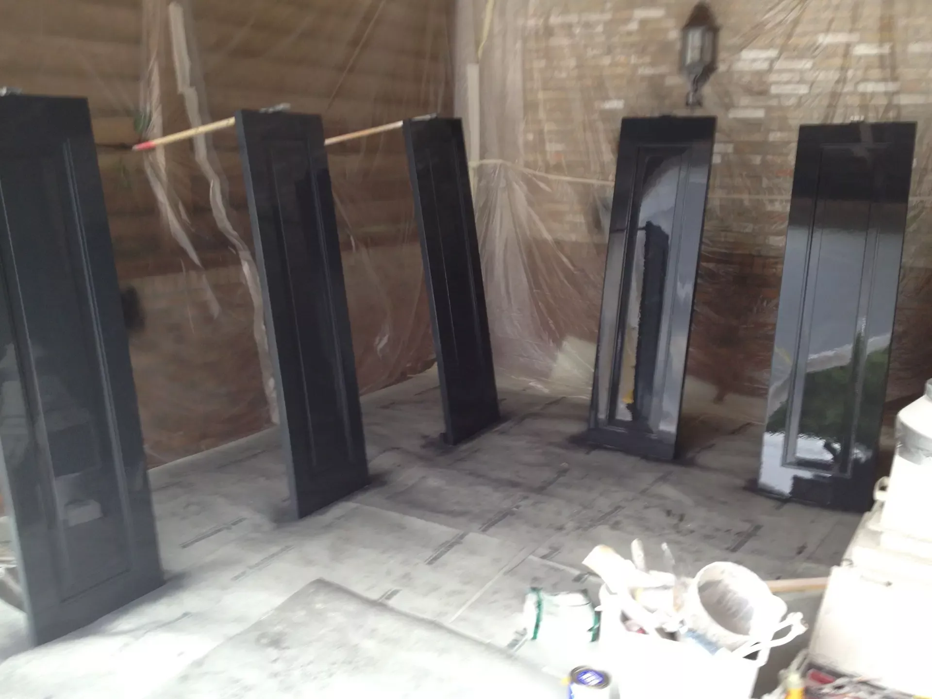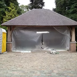 Voor de carport hebben we een tijdelijke spuitcabine ingericht om de luiken te spuiten, terwijl de rest van het houtwerk met de hand is geschilderd. Binnen hebben we alle oppervlakken gespoten voor een uniforme en strakke afwerking.
